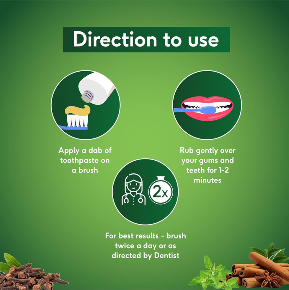 GOODNESS OF HERBS FOR COMPLETE ORAL CARE: Enriched with the power of Cloves, Charcoal, Cinnamon, Pepper, Bakul, & Mayaphal; our toothpaste takes care of your teeth, gums and breath for overall protection and hygiene.